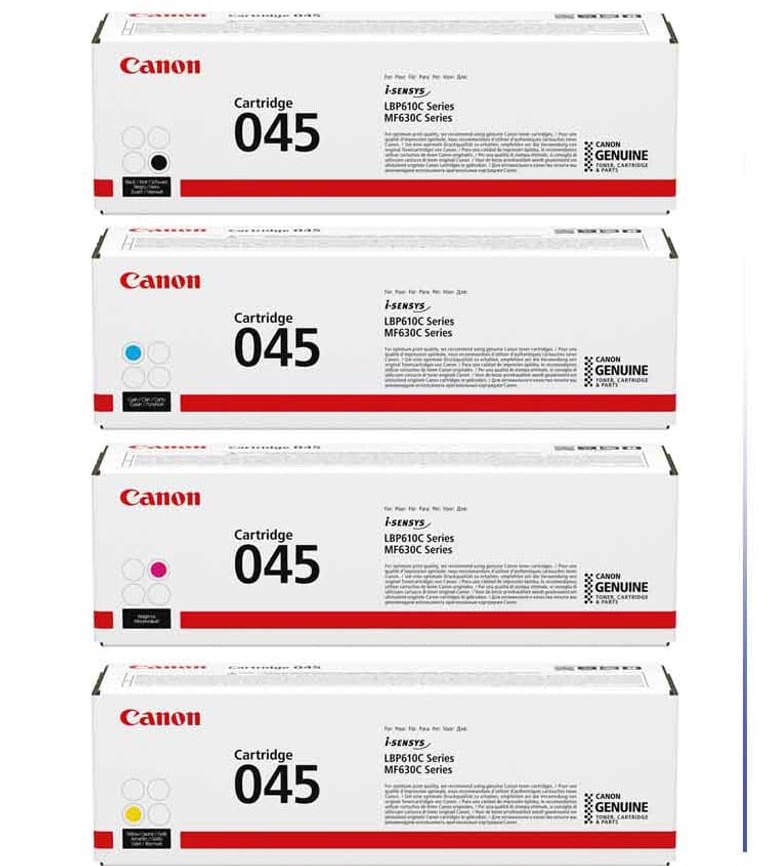 Cartouche 045 CMYK (CMY rendement 1, 300 feuilles/K rendement 1, 400 feuilles) et cartouche 045 CMYK haute capacité (CMY rendement 2, 200 feuilles/K rendement 2, 800 feuilles).