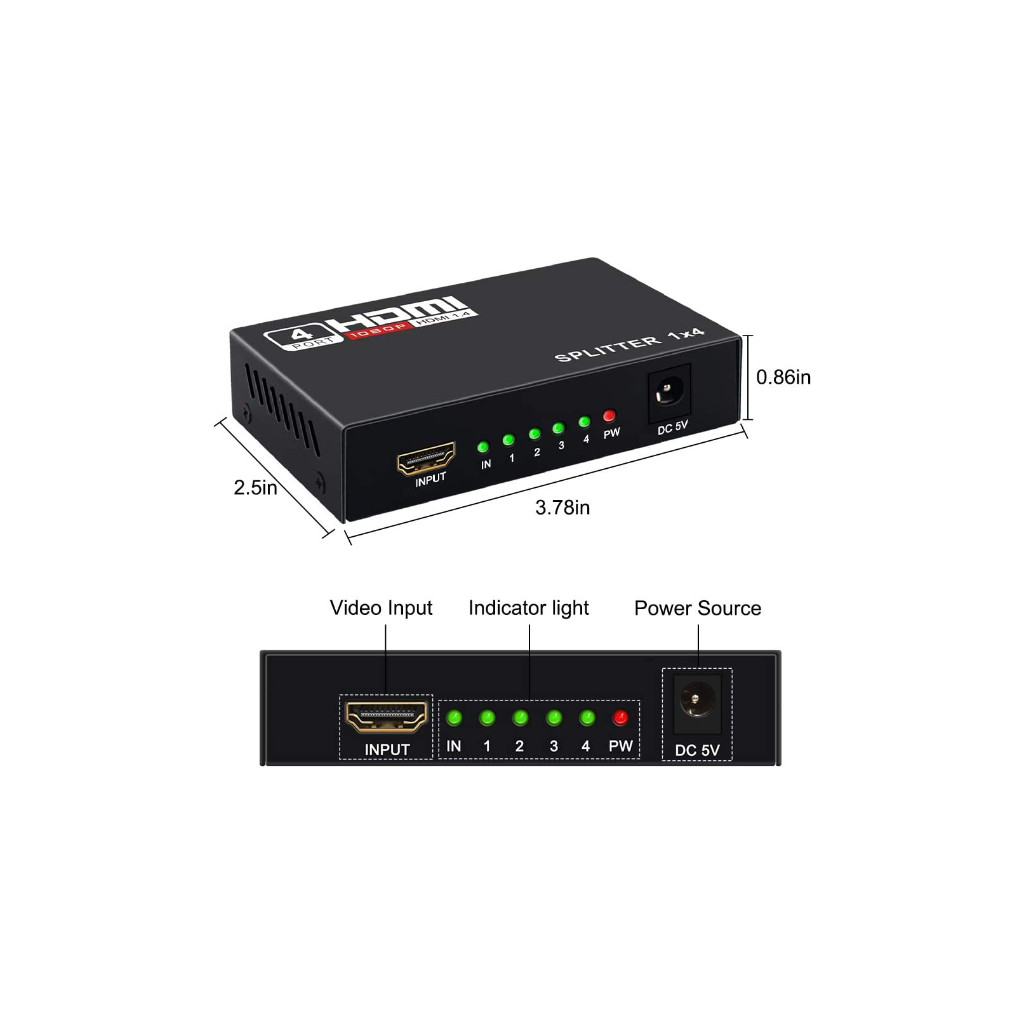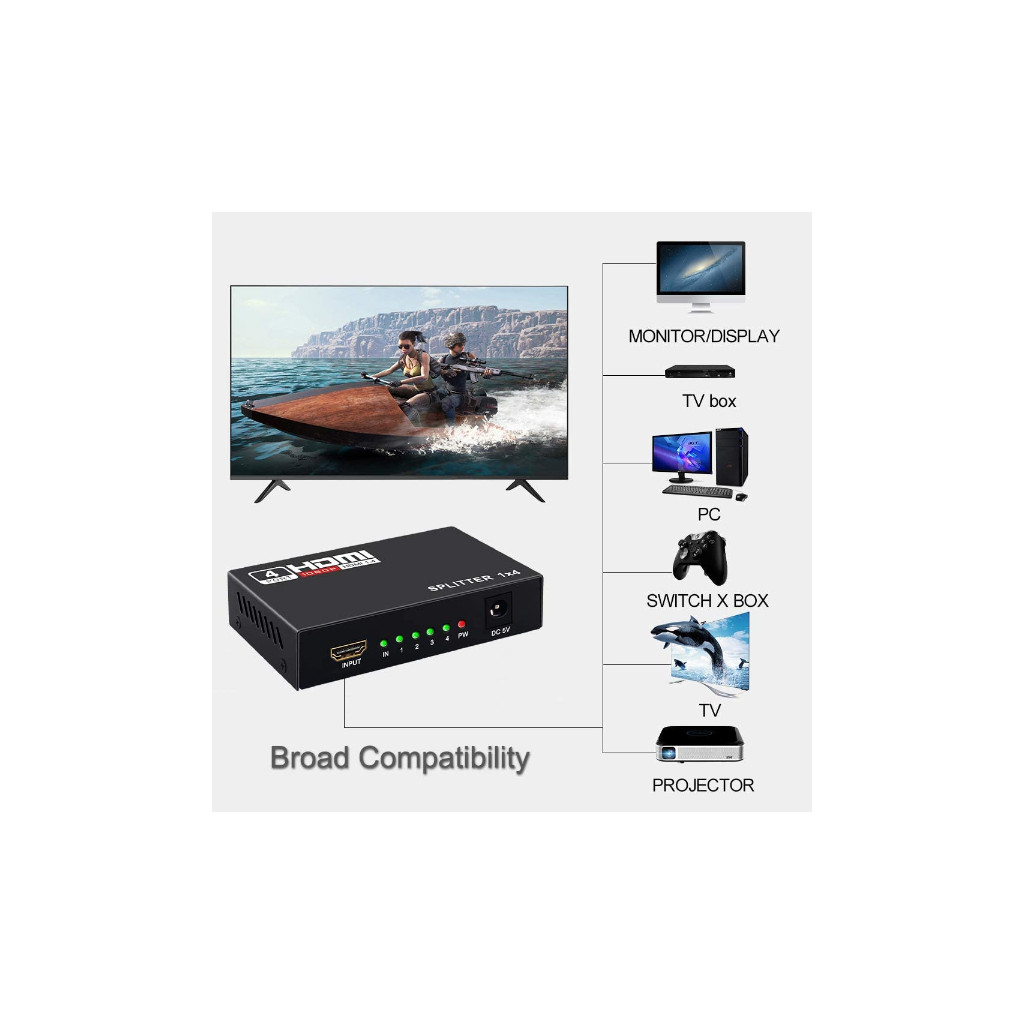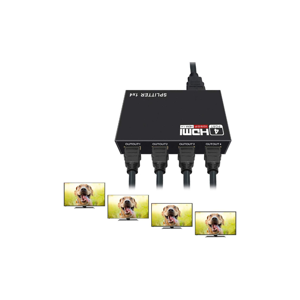 1. Divisez 1 signal d’entrée HDMI en 4 signaux de sortie HDMI identiques, transmettez la vidéo et l’audio simultanément sans aucune perte de qualité.