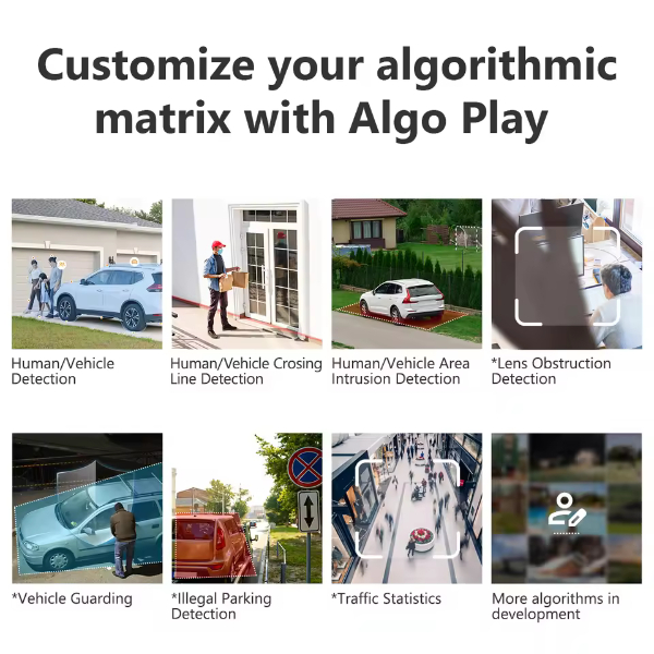 ◉ Détection intelligente : IA pour la reconnaissance des formes humaines et des véhicules, détection de franchissement de ligne, intrusion de zone