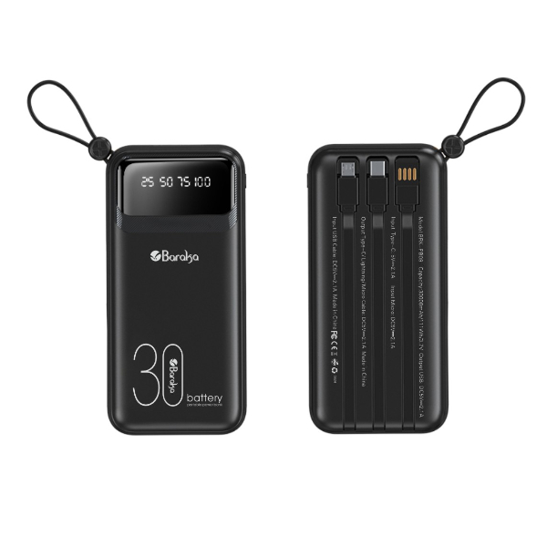 Power Bank 30000mAh Noir Avec 3 Sorties Cable Type-C + Cable Lightning & Cable Micro Et 1 Sortie USB + 2 Entrées Type-C & Micro Et 1 Entrée Cable USB
